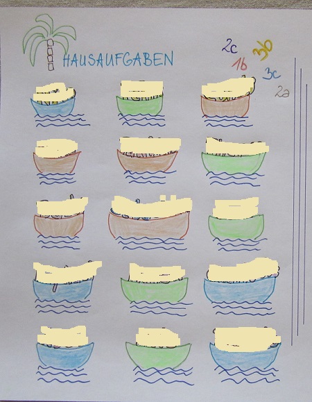 (loďky sú lavice, ich farba oznamuje, do ktorého družstva dieťa patrí, farba jeho mena - čo vy ale nevidíte - zasa prezradí, do ktorej triedy chodí)