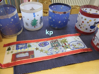 Na nasledujúcej fotografii sú svietniky z fólie na majstrovanie lámp, nastrihanej na pásy. Tie deti pomaľovali alebo inak vianočne vyzdobili podľa vlastných predstáv a zlepili. Chýbajú už iba kahančeky.
