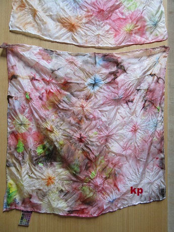Najprv na špice vytŕčajúce z korálok (aj po dve farby) a potom i do okolia. Vďaka vlhkosti sa farba rozpíjala na všetky smery a na šatkách sa vytvárali rôzne zaujímavé vzory.