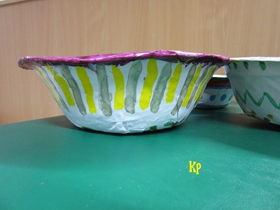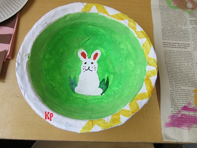 Robili dve skupiny. Na papierovy tanier nalepili niekolko vrstiev novinoveho papiera. Po zaschnuti lepu ho natreli nabielo. Opat nechali vyschnut farbu. Potom akrylovymi farbami kreslili velkonocne motivy. Ked i tieto zaschli, pretreli deti cele dielko lakom.