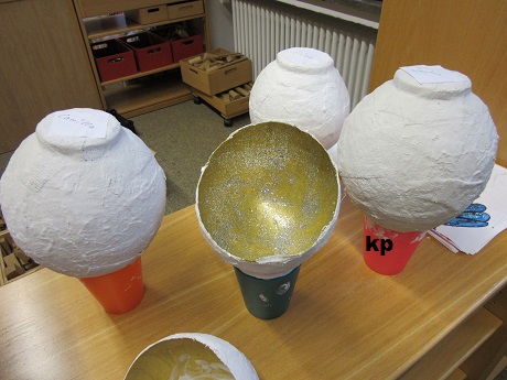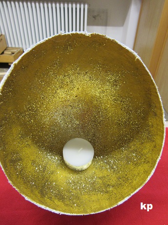 Ku tvorbe použili gipsové zábaly, ktoré naniesli na nafúknutý balón, pričom navrch prichytili väčší umelohmotný uzáver z flašky. Na ňom bude neskôr výtvor pohodlne a isto stáť. Keď gips vyschol, nožíkom balón zrezali na podstavec pre kahanček a vnútro zafarbili dozlata.